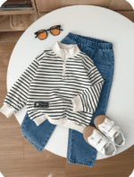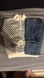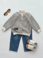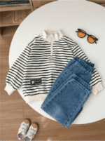 Pull à demi-col roulé multicolore pour hiver avec fermeture éclair, ample, rayé, et pantalon décontracté lavé long. Convient pour la maison, l’extérieur, l’école, la photographie de rue, style coréen.