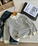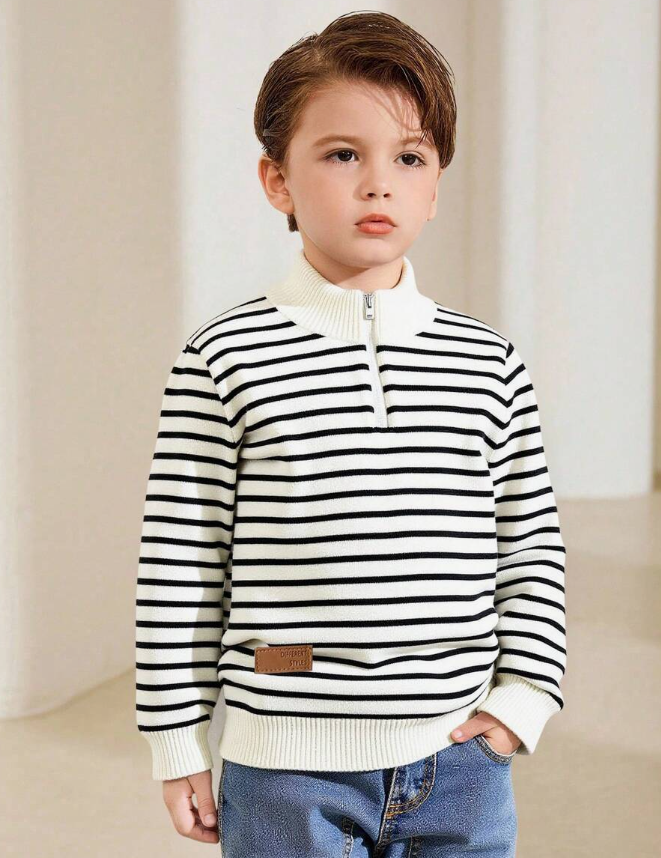 de style universitaire pour garçon, confortable, mode minimaliste, doux et ample, col polo rayé. Convient pour les fêtes d’anniversaire, les rassemblements, les représentations, l’école, la rentrée, le port quotidien, les voyages et les sports en automne/hiver. Pull color block décontracté noir et blanc, pull polo à col montant avec zip.